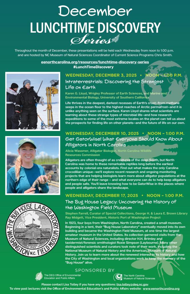 The NCDEQ Office of Environmental Education and Public Affairs hosts a guest lecture series called the "Lunchtime Discovery," hosted and streamed with our partners at the NC Museum of Natural Sciences. Professionals from a wide range of environmental fields give presentations about their work and participate in a live moderated question and answer chat with viewers. Topics range from spider diversity in North Carolina to Geographic Information Systems (GIS), to how to incorporate music in environmental education programming.